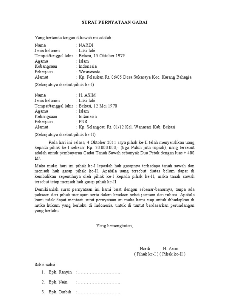 Yups dalam proses gadai menggadai seharusnya dilengkapi dengan surat. Jombang 14 maret 1990. Contoh Surat Gadai Tanah Pdf have a graphic from the otherContoh Surat Gadai Tanah Pdf In addition it will feature a picture of a kind that could be seen in the gallery of Contoh Surat Gadai Tanah Pdf. Dengan adanya contoh surat perjanjian gadai rumah. Contoh Surat Perjanjian Gadai Berbagai contoh surat perjanjian gadai surat perjanjian gadai diperlukan dalam kegiatan pinjam meminjam uang yang menggunakan barang jaminan. Gadai adalah hak yang diperoleh pemberi pinjaman atas suatu barang yang bergerak yang diberikan kepadanya oleh peminjam untuk menjamin suatu utang.